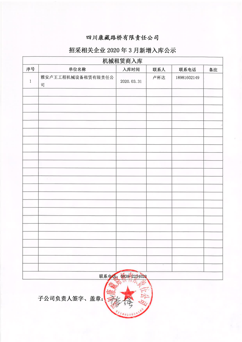 四川康藏路桥有限责任公司招采相关企业2020年3月新增入库公示