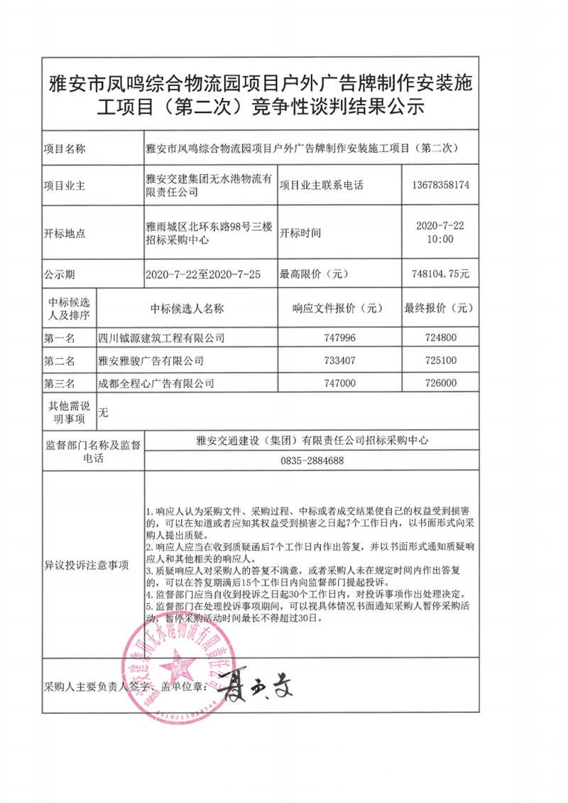 DB视讯 集团无水港物流有限责任公司雅安市凤鸣综合物流园项目户外广告牌制作安装施工项目(第二次)竞争性谈判结果公示