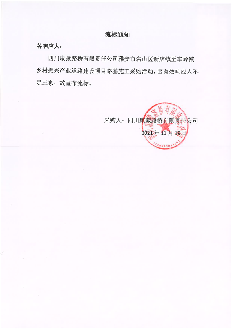 四川康藏路桥有限责任公司雅安市名山区新店镇至车岭镇乡村振兴产业道路建设项目路面施工采购流标通知