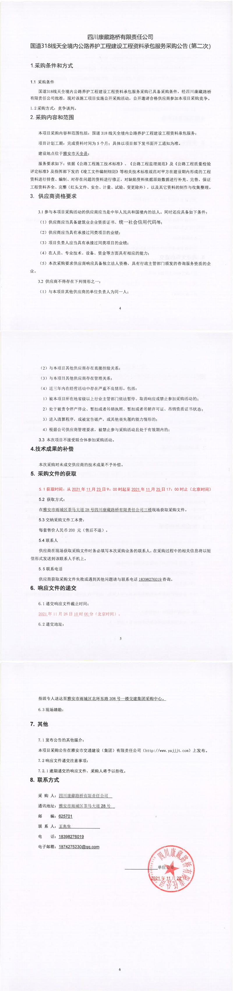 四川康藏路桥有限责任公司国道318线天全境内公路养护工程建设工程资料承包服务采购公告(第二次)