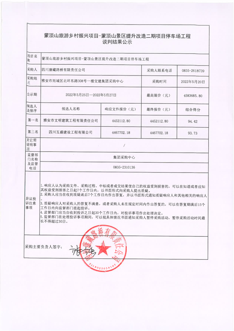 四川康藏路桥有限责任公司蒙顶山旅游乡村振兴项目-蒙顶山景区提升改造二期项目停车场工程谈判结果公示