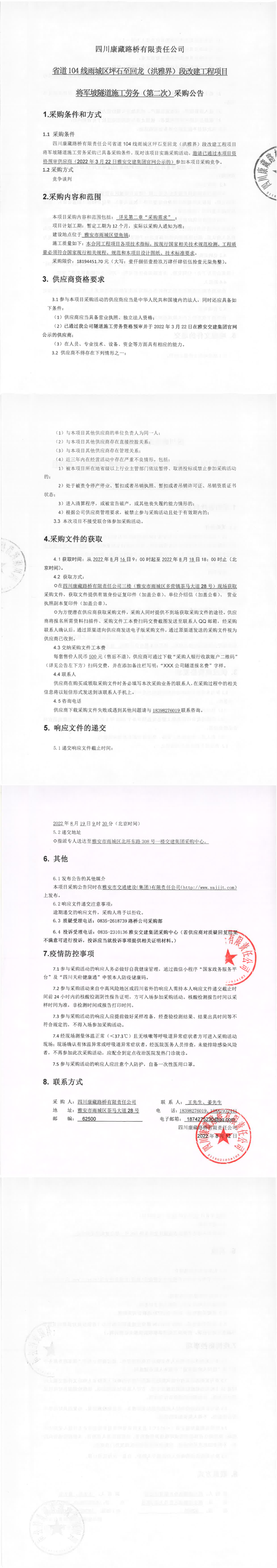 四川康藏路桥有限责任公司省道104线雨城区坪石至回龙(洪雅界)段改建工程项目