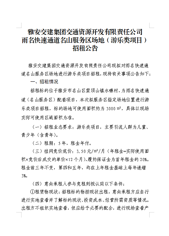DB视讯 集团交通资源开发有限责任公司雨名快速通道名山服务区场地(游乐类项目)招租公告附件