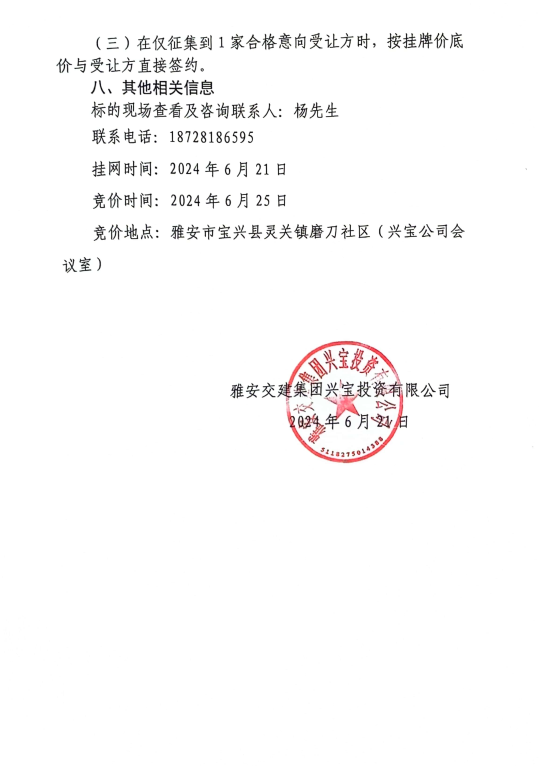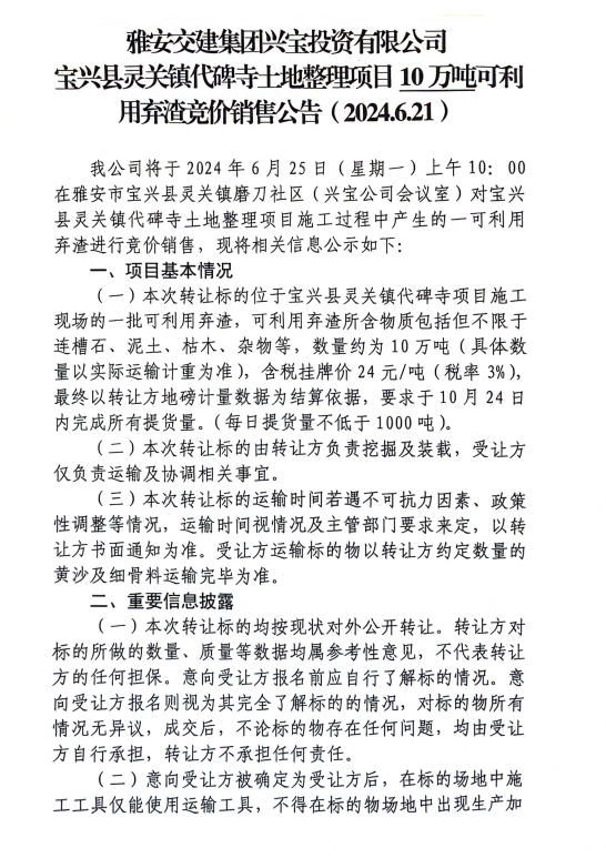DB视讯 集团兴宝投资有限公司宝兴县灵关镇代碑寺土地整理项目10万吨可利用弃渣竞价销售公告(2024.6.21)