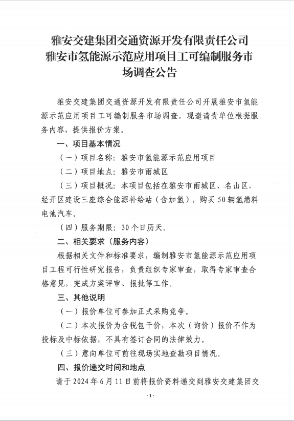 DB视讯 集团交通资源开发有限责任公司雅安市氢能源示范应用项目工可编制服务市场调查公告