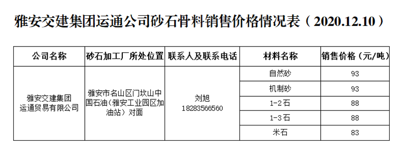 DB视讯 集团运通公司砂石骨料销售价格情况表(2020.12.10)